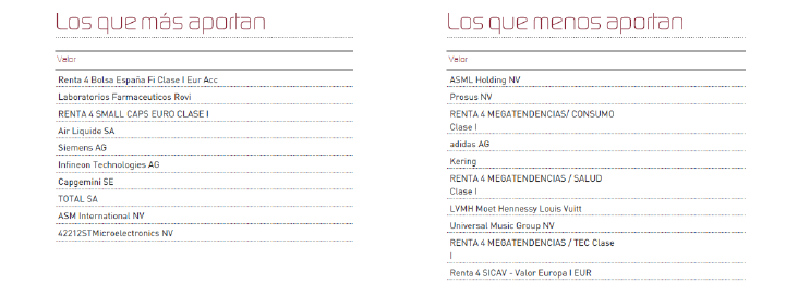 Los activos que más rentabilidad aportaron han sido los fondos renta 4, Bolsa España, Laboratorios ROVI, el fondo renta 4 Small Caps Euro, Air Liquide y Siemens. Por el lado de las que menos aportan encontramos ASML, Prosus, el fondo de consumo, Asidas y Kering.