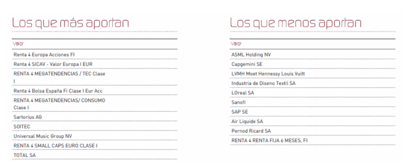 Los activos que más han aportado en el semestre han sido los fondos de Renta 4, por su elevada ponderación, seguido de Sartorius, Soitec, Universal Music y Total. por contraposición, los únicos valores en negativo han sido ASML Capgemini, LVMH, Inditex y L’Oréal.