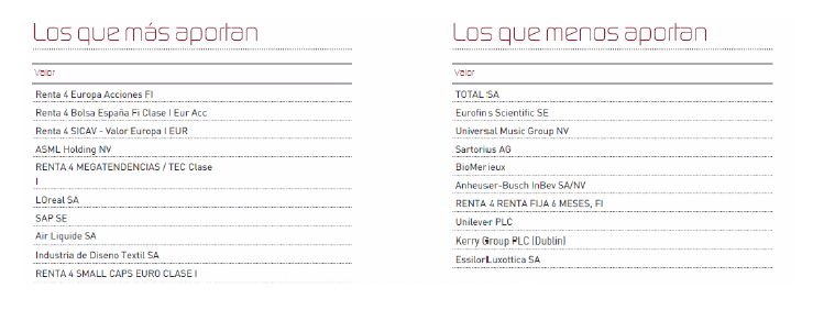 Los activos que más han aportado en el semestre han sido los fondos, renta 4 Europa Acciones, Renta 4 Bolsa España, ASML Holdings, Renta 4 megatendencias tecnología y L´Oréal, por contraposición, los únicos valores en negativo han sido Eurofins, Total, Universal Music, Biomerieux y Sartorius.