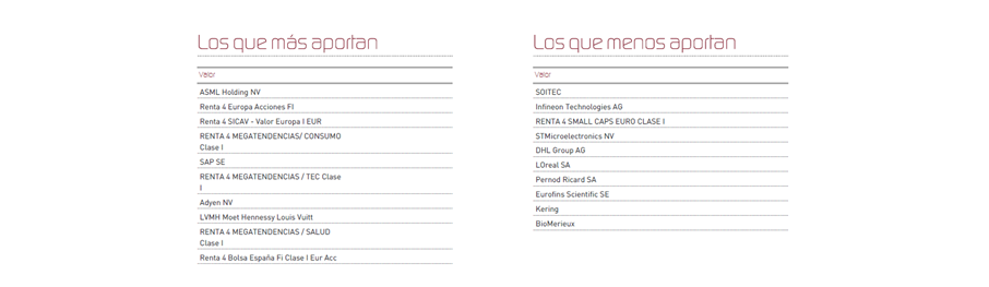 Los activos que más rentabilidad aportaron han sido ASML Holding, los fondos renta 4, Europa Acciones y Renta 4 Megatendencias Consumo, SAP, Adyen y LVMH. Por el lado de las que menos aportan encontramos Soitec, Infineon, STMicroelectronics y el fondo Renta 4 Small caps euro.