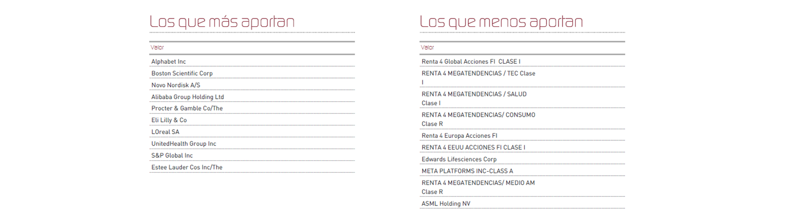 Los activos que más rentabilidad aportaron han Alphabet, Boston Scientific, Novo Nordisk y Alibaba. Por el lado negativo, los que más rentabilidad drenaron fueron Edwards, Meta y ASML, además de los fondos por su elevada exposición.