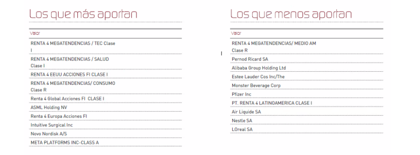 Los activos que más han contribuido en el mes, junto con los fondos de renta 4 por su elevada exposición, han sido los títulos de ASML, Intuitive Surgical, Novo Nordisk y Meta. Por contraposición, los valores que drenaron rentabilidad fueron Pernod Ricard, Alibaba, Estee Lauder y Monster.