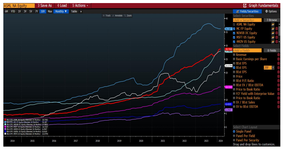 Las grandes compañías que mayor representación tienen en los índices van viendo incrementado su peso al revalorizarse cada trimestre premiando el crecimiento de sus beneficios y la buena gestión empresarial. No solo en EEUU con las “7 magníficas”, que han reportado espectaculares resultados (en cartera: Amazon, Microsoft, Alphabet y Meta), sino también en Europa donde las mayores compañías (en cartera ASML, LVMH y Novo Nordisk) han reportado sin quedarse atrás.