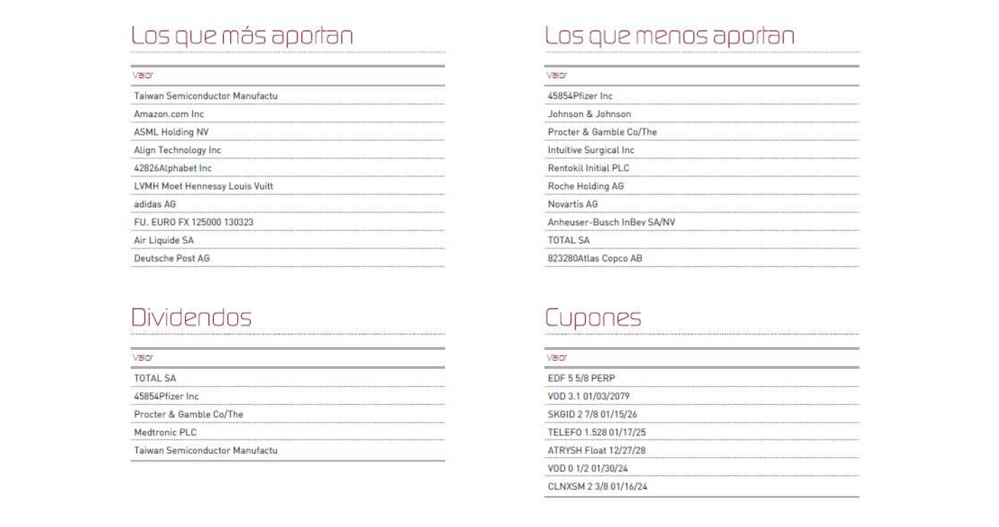 El movimiento más relevante del mes ha sido la venta de Cooper Companies por la fuerte revalorización, exigente valoración y poco peso en cartera. Los activos que más y menos han aportado a la rentabilidad de Renta 4 Activos Globales FI fueron: