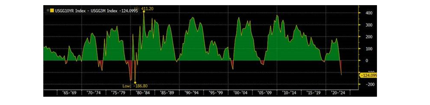 Por otro lado, el escenario que dibuja la curva de tipos en EEUU, completamente invertida, señala un elevado riesgo de recesión en los próximos meses que ineludiblemente afectaría negativamente al crecimiento económico y a los beneficios de las compañías. El análisis de la curva de tipos nos dice lo que es más probable que ocurra, pero no cuando y desde que nivel económico y de beneficios.