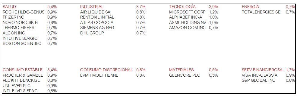 La cartera de renta variable está compuesta mayoritariamente por compañías globales del sector salud, consumo y tecnología que representan el 75% de la cartera de renta variable y que tienen un sesgo bastante defensivo en general. El otro 25% está compuesto por alguna compañía industrial y de energía o materias primas. En la siguiente tabla se ve claramente cual es la distribución sectorial.