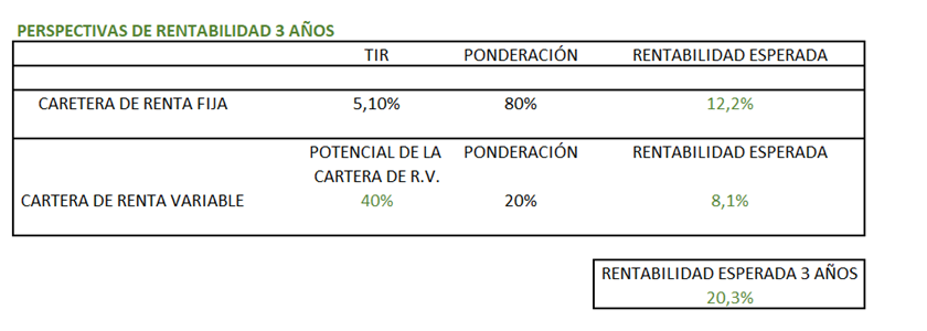 Matemáticamente, la planificación de rentabilidad para los próximos 3 años si mantenemos la exposición a bolsa actual (80% RF y 20% RV) con las rentabilidades que esperamos en ambos tipos de activos serían: retornos del +20,3% a 3 años que se distribuirían en: +12,2% lo que aportaría el 80% invertido en renta fija, y +8,1% lo que aportaría el 20% de exposición a renta variable como se observan en la siguiente tabla: