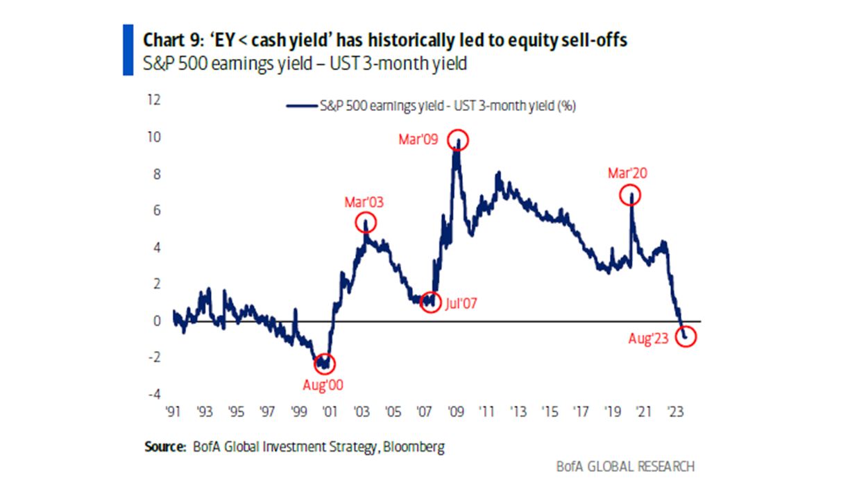 El Earnings Yield (beneficios / capitalización bursátil) en EEUU está por debajo del nivel de tipos de interés a corto plazo, que estaría justificado si esperamos que el crecimiento de los beneficios se re-acelere el próximo año. En el gráfico superior se observa que no es nada habitual que el Earnings Yield sea menor al Cash Yield.