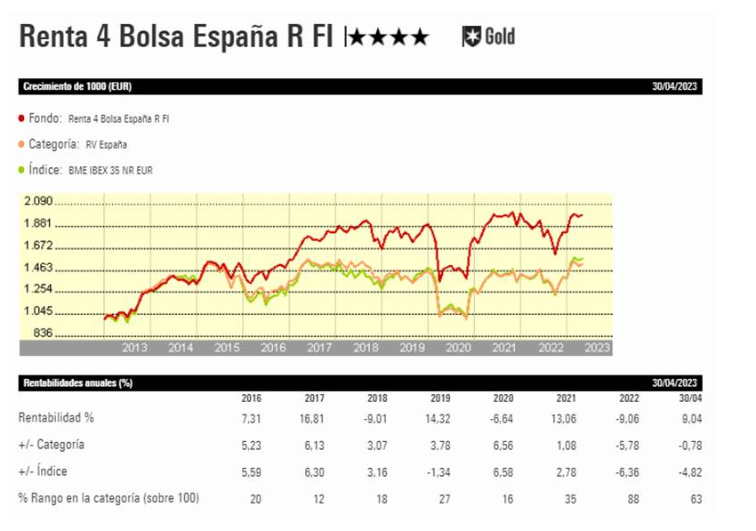 Renta 4 Bolsa España FI ha sido catalogado por Morningstar con rating GOLD a nivel cualitativo y 4 estrellas Morningstar. Según la empresa de mayor reconocimiento en el análisis independiente de fondos de inversión: “El Medalist Rating es el sistema de calificación de Morningstar orientado al futuro, impulsado cuantitativa y analíticamente, que se expresa con indicadores Gold, Silver, Bronze, Neutral y Negative. El Rating Medalist unifica los conocimientos y procesos de los analistas Morningstar con modelos de aprendizaje automático escalables. Los inversores pueden usar la calificación Medalist para formar expectativas de cómo se comportará un fondo durante un ciclo de mercado completo cuando en comparación con un índice de referencia relevante o fondos similares.”