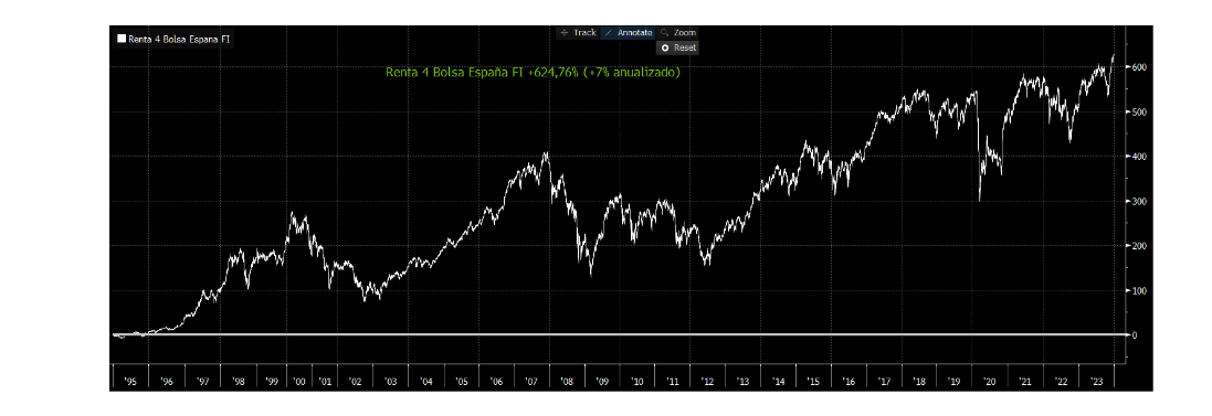 Este año Renta 4 Bolsa España ha cumplido 30 años desde su creación obteniendo una rentabilidad desde entonces de +624,76% que supone una rentabilidad anualizada en línea con la rentabilidad esperada de la renta variable históricamente.