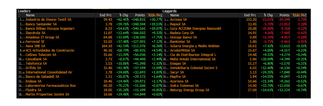 Renta 4 Bolsa España FI obtiene una rentabilidad de +20,13% y +19,42% en sus dos clases en 2023. La bolsa española ha tenido un comportamiento espectacular durante todo el año impulsado por la revalorización de casi el +60% de Inditex, del +46% de BBVA y de +35% del Santander, compañías con un peso conjunto del 35% en el Ibex 35 y que explican prácticamente el 70% o un +15% de toda la subida de la bolsa española en el año.