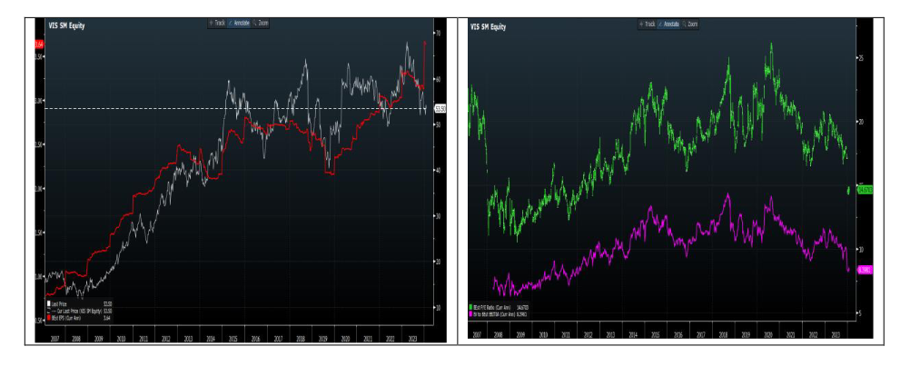 Una de las posiciones más relevantes del fondo es Viscofán donde tenemos un 6% del patrimonio invertido, y lleva un comportamiento frustrante en 2023. Viscofán ha caído más del 20% desde los máximos de marzo de 2023 en un periodo que la bolsa española ha subido un +7%. Las ventas y el beneficio de 2023 aunque están por debajo de lo que ellos mismos guiaron, sigue mostrando crecimiento de dígito simple medio por lo que el de-rating que ha sufrido es bastante relevante.