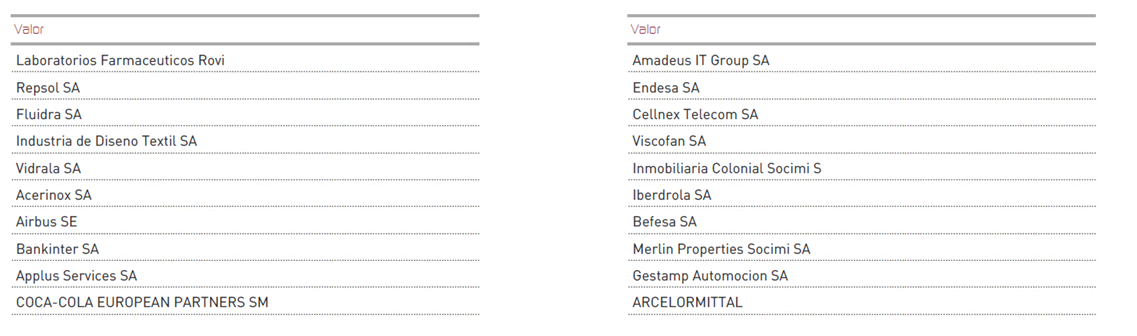 Las empresas españolas en las que actualmente encontramos las compañías que cumplen nuestros criterios de calidad, se encuentran fundamentalmente en el sector salud, consumo, tecnología e industrial.