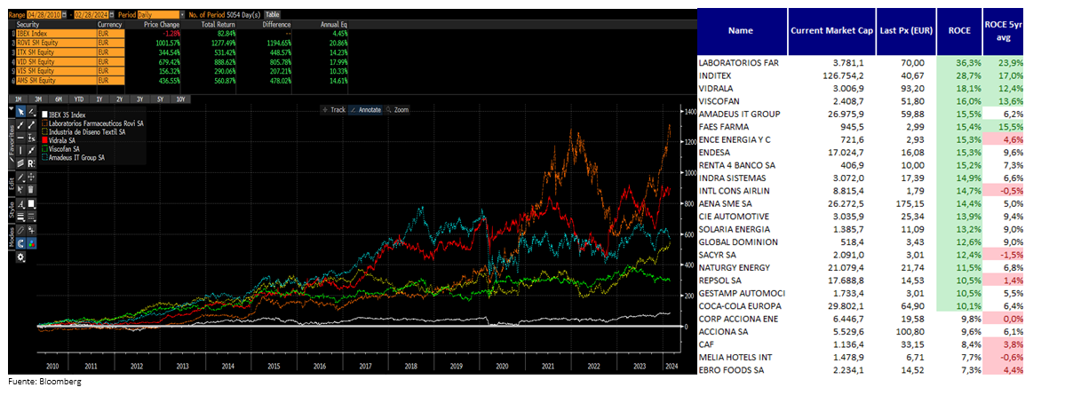 Algunas de las compañías españolas con mayor RoCE de la última década (fuente Bloomberg) son: Rovi, Inditex, Vidrala, Viscofán y Amadeus que, como se puede ver en el gráfico inferior, han obtenido retornos para sus accionistas muy por encima del rendimiento de la bolsa española (entre un +200% y un +1200% mejor comportamiento en los últimos 14 años), y es uno de los principales motivos por los que, entre estas 5 compañías Renta 4 Bolsa España FI tiene un peso de alrededor del 30%.