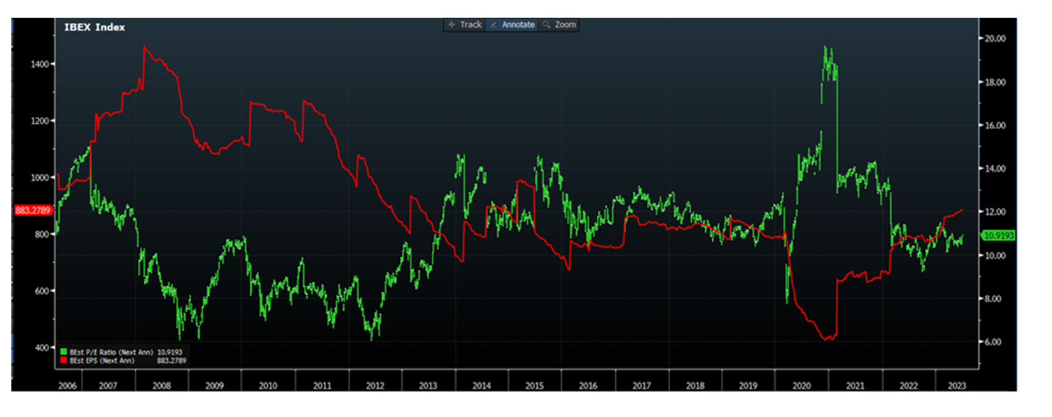 La realidad objetiva es que la bolsa española en términos de beneficios sigue sorprendiendo positivamente por su velocidad de recuperación desde el 2021, y las valoraciones están un 25% por debajo de lo que sería la valoración histórica del Ibex (13x PER) y también, por qué no decirlo, de una valoración sensata.