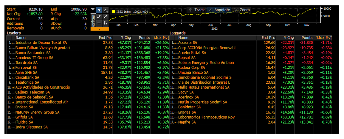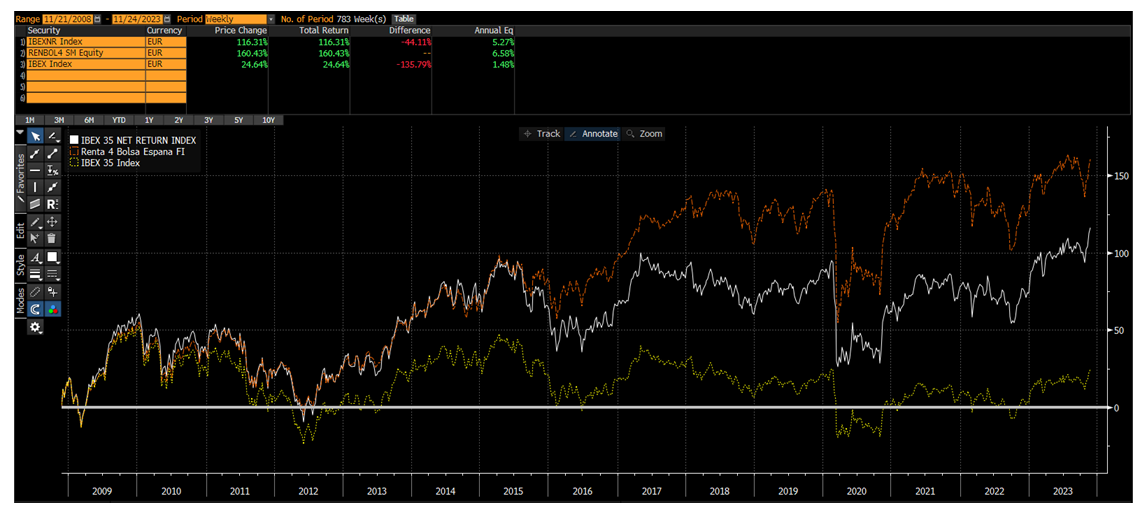 Entrando a comentar el comportamiento de Renta 4 Bolsa España FI en estos 11 meses de 2023, hay que reconocer que a pesar de ofrecer una rentabilidad muy alta en lo que llevamos de año +15,8%, ésta está por debajo de la rentabilidad que ha aportado el Ibex 35 que supera el +22,2% en 2023.