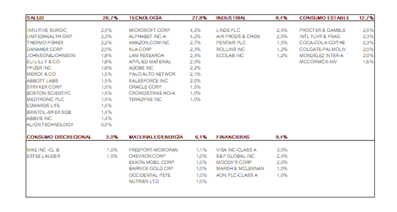 La cartera de acciones cumple mayoritariamente los criterios de calidad que exigimos (ventajas competitivas, elevada visibilidad, márgenes elevados, alta generación de caja, bajos niveles de endeudamiento, retornos (ROE y ROCE) altos y con alta visibilidad de que mantengan la senda de crecimiento de los beneficios los próximos años. Aunque a corto plazo el mercado es impredecible, con el paso de los años es el crecimiento de los beneficios el que explica la valoración de una empresa y su revalorización, y estamos invertidos en compañías que con elevada visibilidad y probabilidad van a seguir creciendo sus ventas y sus beneficios de una forma rentable los próximos años.