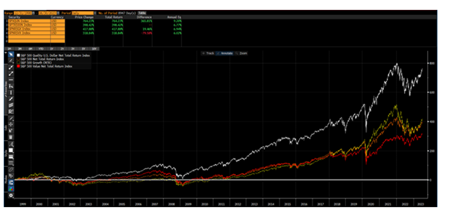 La selección de compañías que hay en la cartera de Renta 4 EEUU Acciones FI están basadas en la filosofía de inversión que mejor rentabilidad ha obtenido en el largo plazo frente a cualquier otra estrategia: el Quality Investing como se puede observar en el siguiente gráfico de comportamiento: