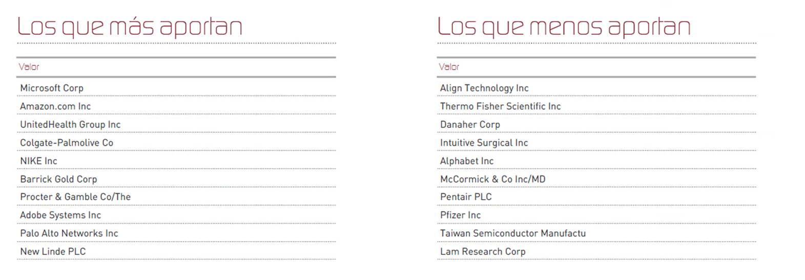 Dentro del comportamiento de la cartera, destaca la fuerte apreciación de compañías como Microsoft y Amazon, y la caída de compañías de tecnología médica como Align, Thermo Fisher, Danaher e Intuitive Surgical. Las compañías de la cartera de Renta 4 EEUU Acciones FI que mejor y peor comportamiento han tenido en el mes fueron:
