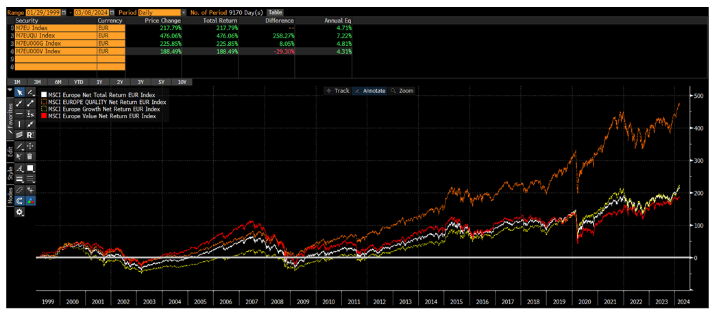 Sin embargo, es un análisis que se demuestra muy errático y que no funciona como estrategia. La filosofía “Value” que busca invertir en las compañías más baratas de cada área de inversión, obtiene rentabilidades muy inferiores a los principales índices europeos como se observa en el siguiente gráfico (fuente Bloomberg):