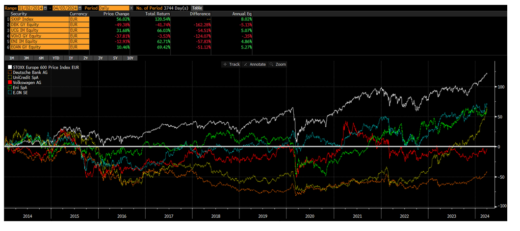 Echando la vista atrás 10 años, las compañías que estaban más baratas en términos de su valor contable en el Stoxx 50 eran Deutsche Bank, Unicredit, E.ON, Volkswagen y ENI (fuente Bloomberg).
