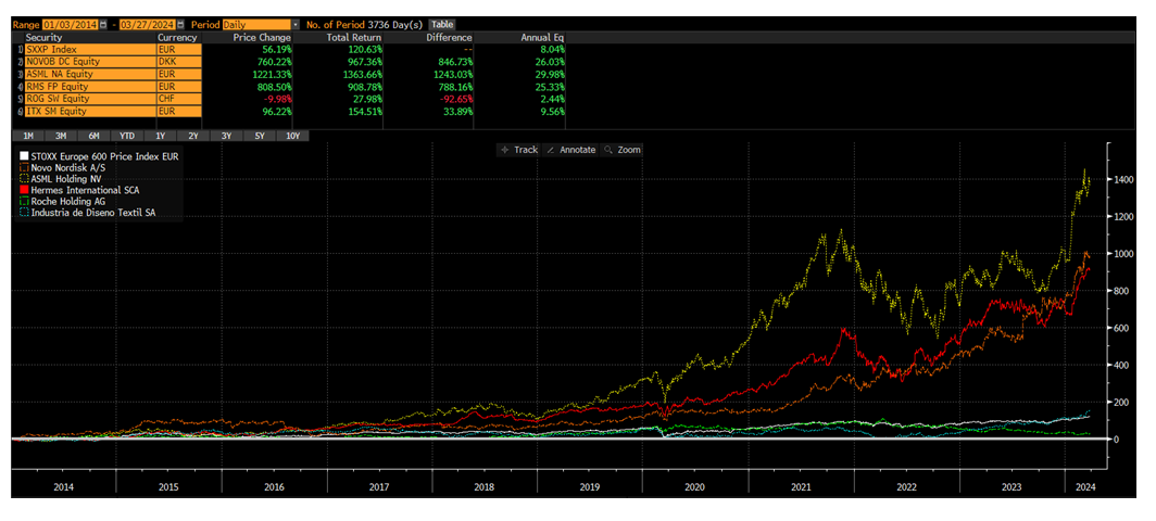 Los ROIC medios de 2014 de estas compañías (fuente Bloomberg), estaban entre el 52% de Novo Nordisk y el 25% de ASML. El comportamiento posterior no deja lugar a la duda obteniendo rentabilidades de entre un +34% y un +1.243% superior a la bolsa europea a excepción como he comentado anteriormente de Roche.