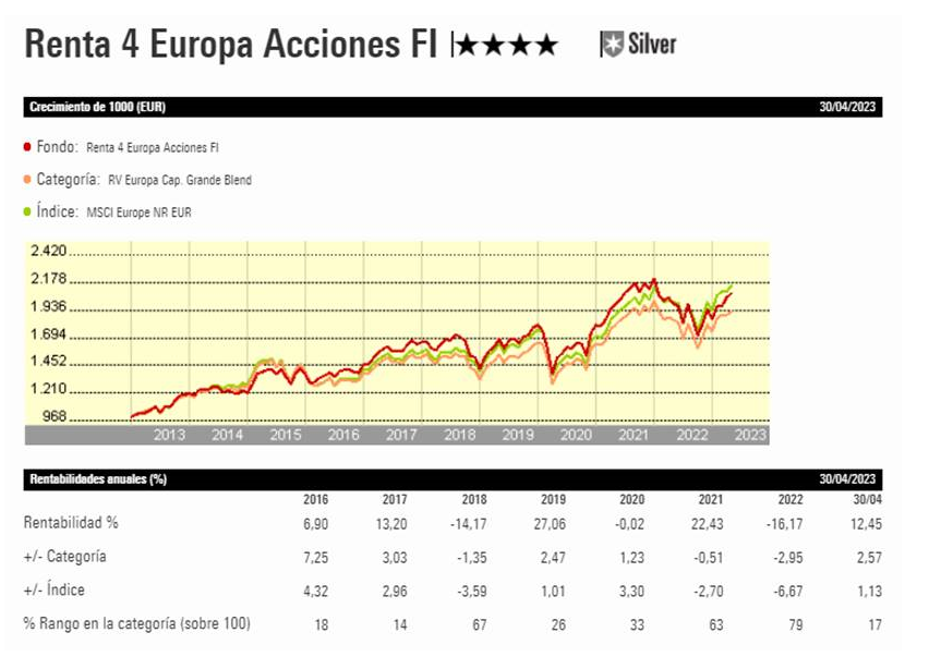 Renta 4 Europa Acciones FI ha sido catalogado por Morningstar con rating SILVER a nivel cualitativo y 4 estrellas Morningstar. Según la empresa de mayor reconocimiento en el análisis independiente de fondos de inversión: “El Medalist Rating es el sistema de calificación de Morningstar orientado al futuro, impulsado cuantitativa y analíticamente, que se expresa con indicadores Gold, Silver, Bronze, Neutral y Negative. El Rating Medalist unifica los conocimientos y procesos de los analistas Morningstar con modelos de aprendizaje automático escalables. Los inversores pueden usar la calificación Medalist para formar expectativas de cómo se comportará un fondo durante un ciclo de mercado completo cuando en comparación con un índice de referencia relevante o fondos similares.”