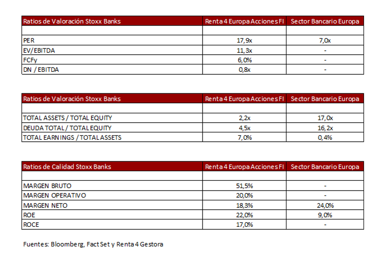 El sector bancario no cumple ninguno de nuestros criterios de calidad por lo que es muy difícil que tengamos una ponderación relevante en Renta 4 Europa Acciones FI tenga el peso que tenga en la bolsa europea.