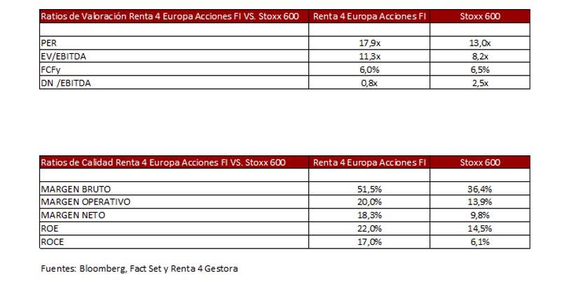 La cartera de Renta 4 Europa Acciones FI está compuesta fundamentalmente por sectores de salud, consumo, industriales y tecnología con lo que conseguimos tener una cartera de acciones con unos ratios de calidad mucho mejores (mayores márgenes, mayor generación de caja, mayores retornos y menor endeudamiento) que la bolsa europea, que son las variables más relevantes para obtener mejores retornos en el largo plazo.