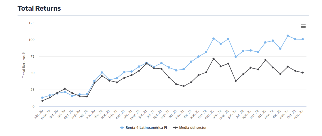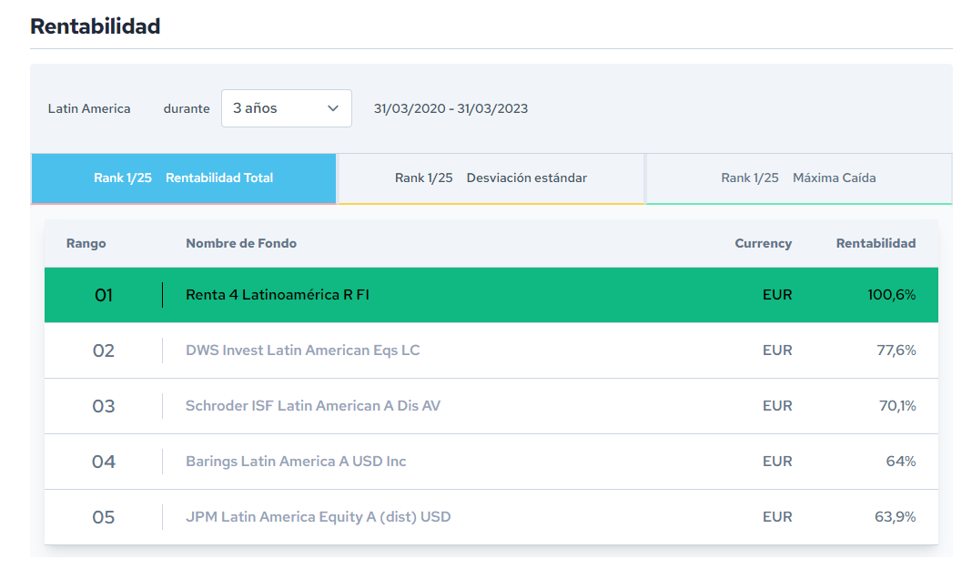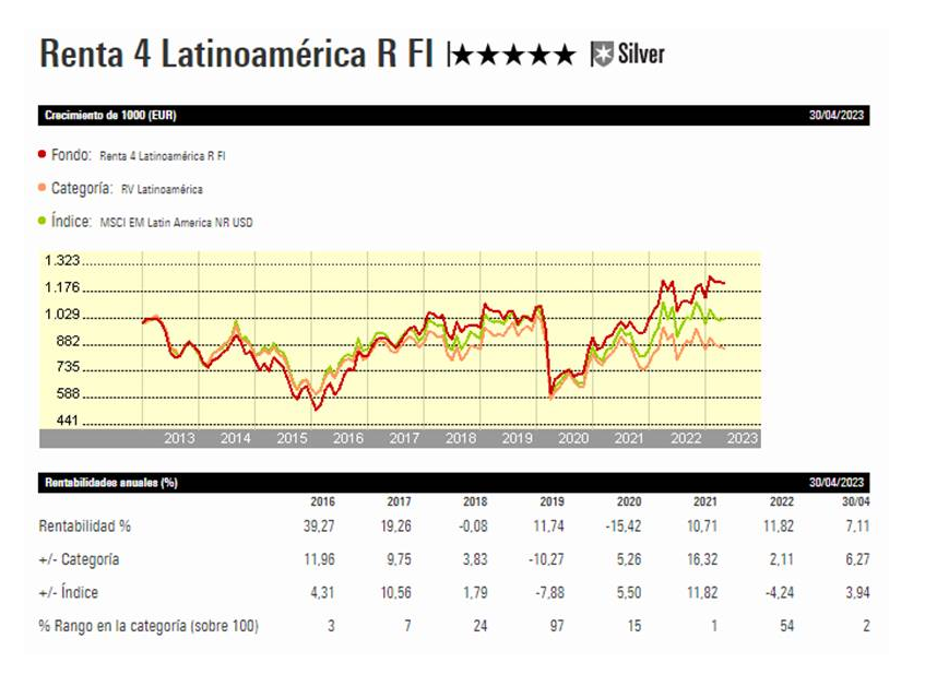 El fondo Renta 4 Latinoamérica figura como mejor fondo a 3 años en el último ránking de Citywire de su categoría con una rentabilidad acumulada superior al 100% en los últimos 3 años (datos del cierre de marzo 23).