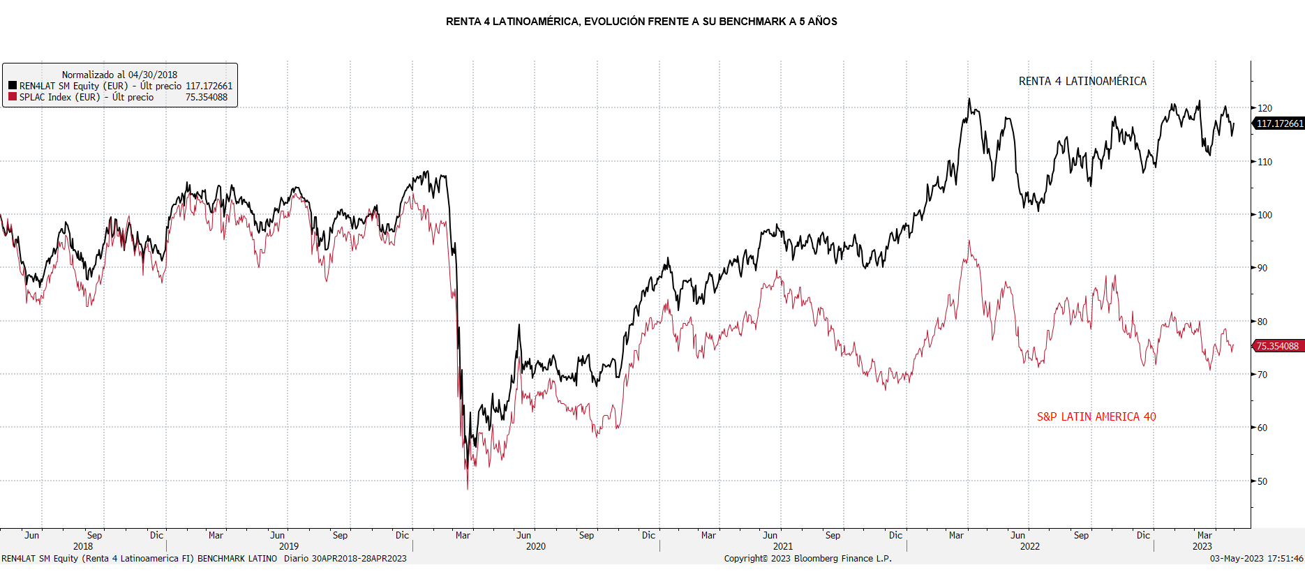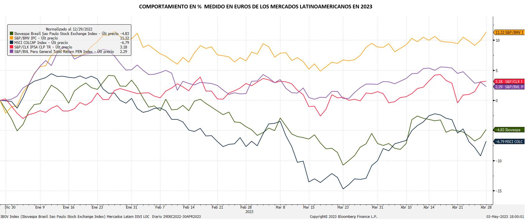 El fondo Renta 4 Latinoamérica recortó en abril un 0,3%, un comportamiento ligeramente por debajo pero no muy alejado de su índice de referencia el S&P Latin América 40, que hizo prácticamente plano en euros, dejando la rentabilidad acumulada en el año en +7,1%. Los mercados latinoamericanos siguen frenados a pesar de la debilidad del dólar pero debido al peor comportamiento en bolsa de los sectores ligados a materiales básicos, y en parte afectados por el endurecimiento del crédito como consecuencia de la crisis en la banca regional americana, muy afectada por la abrupta subida de tipos en Estados Unidos. El Bovespa brasileño, mostró el mejor comportamiento a nivel de índices, sumando un 2,5% (un 2,3% en euros). El resto de mercados mostraron un comportamiento razonablemente bueno como el Mexbol mexicano sumó un 2,26% (sumó +1,04% en euros), el Colcap colombiano sumó un 3,56% (+0,93% en euros) y el S&P Perú bajó un 0,34% (-0,45% en euros) mientras que el mercado chileno IPSA sumó 1,7% (bajó un 0,86% en euros). El fondo Renta 4 Latinoamérica mantiene un buen tono en este 2023 tras un excelente 2022, gracias a su mix óptimo de exposición a los diversos mercados sudamericanos.