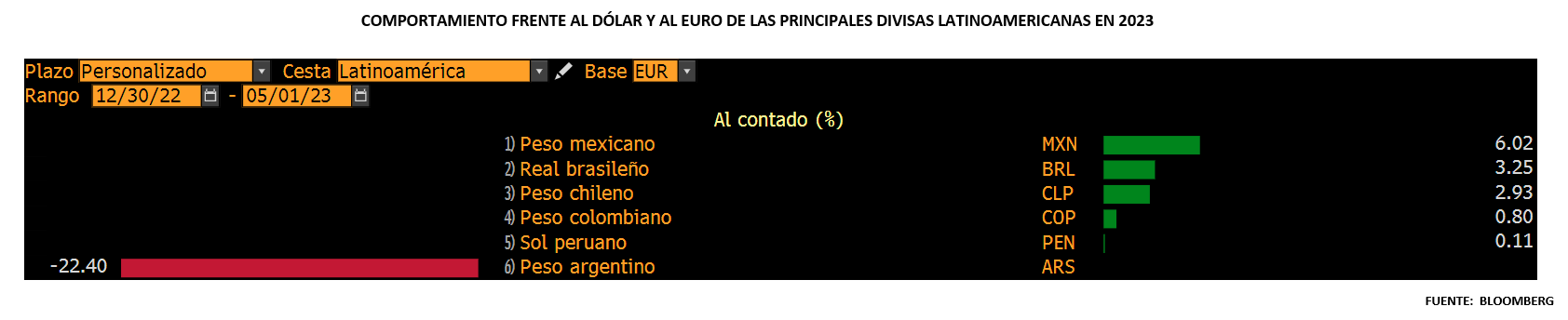 Las divisas latinoamericanas, mantienen cierta estabilidad, lo que está favoreciendo el comportamiento del fondo. En especial, el peso mexicano, que ha tomado el relevo del real brasileño del pasado año, está permitiendo un comportamiento brillante de nuestro fondo. Esta es la razón por la que en el análisis por mercados, México y Chile están apoyando el buen comportamiento del fondo.