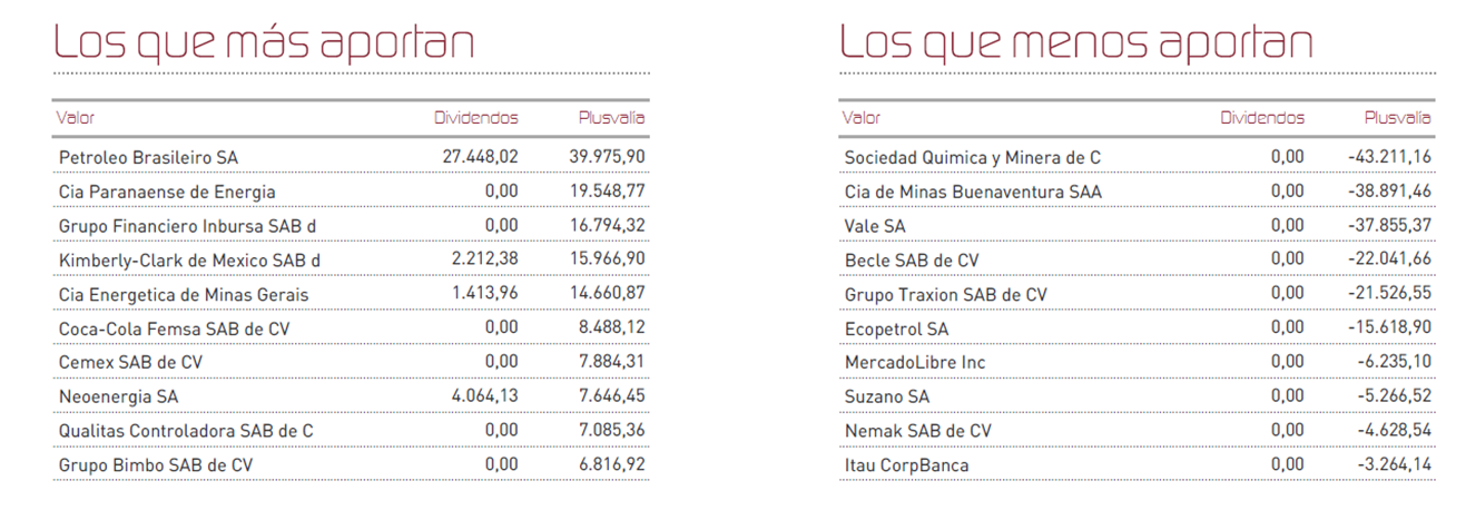 Lo más destacado del mes, ha sido el anuncio de nacionalización de los yacimientos de Litio en Chile, por parte del gobierno. Este anuncio, supuso una fuerte bajada de los títulos de SQM, en la que manteníamos una posición significativa. Durante el mes, sin embargo, nos hemos visto beneficiados del comportamiento de Petrobrás, nuestra primera posición en el fondo, y de la buena trayectoria de los títulos mexicanos, que siguen respondiendo favorablemente.