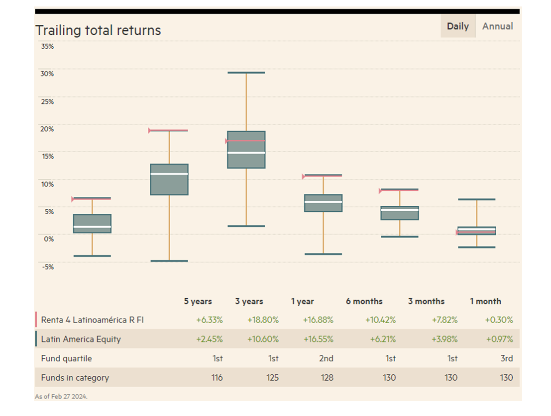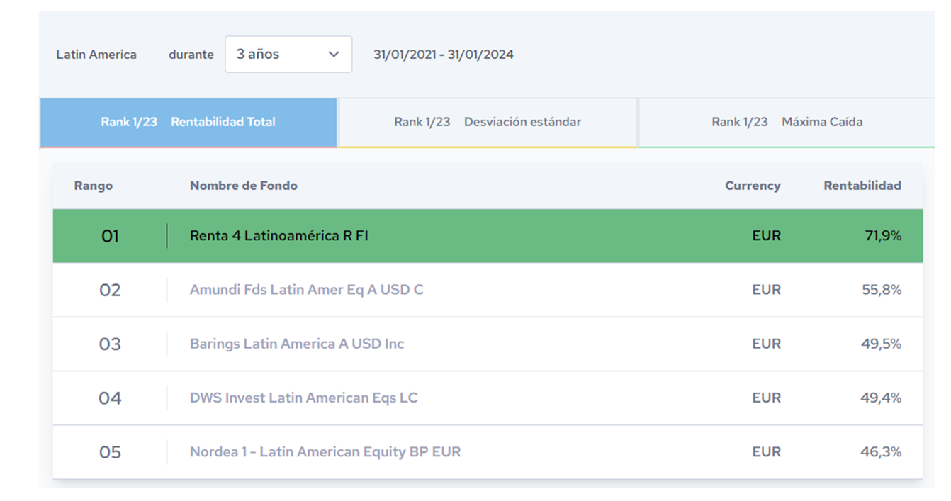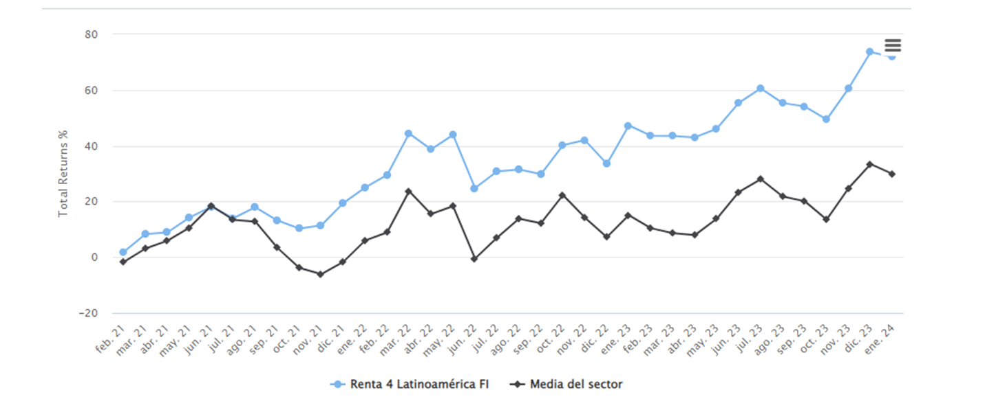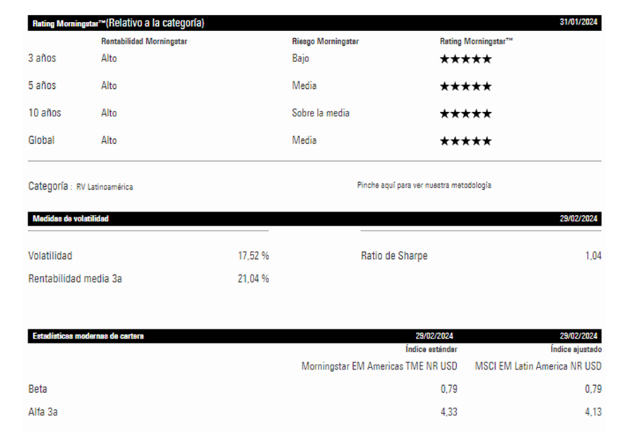 El fondo Renta 4 Latinoamérica figura como mejor fondo a 3 años en el último ránking de Citywire de su categoría con una rentabilidad acumulada del 71,9% en los últimos 3 años (datos del cierre de enero de 2024) y ha sido calificado como un fondo 5 estrellas “Bronze” por parte de Morningstar.