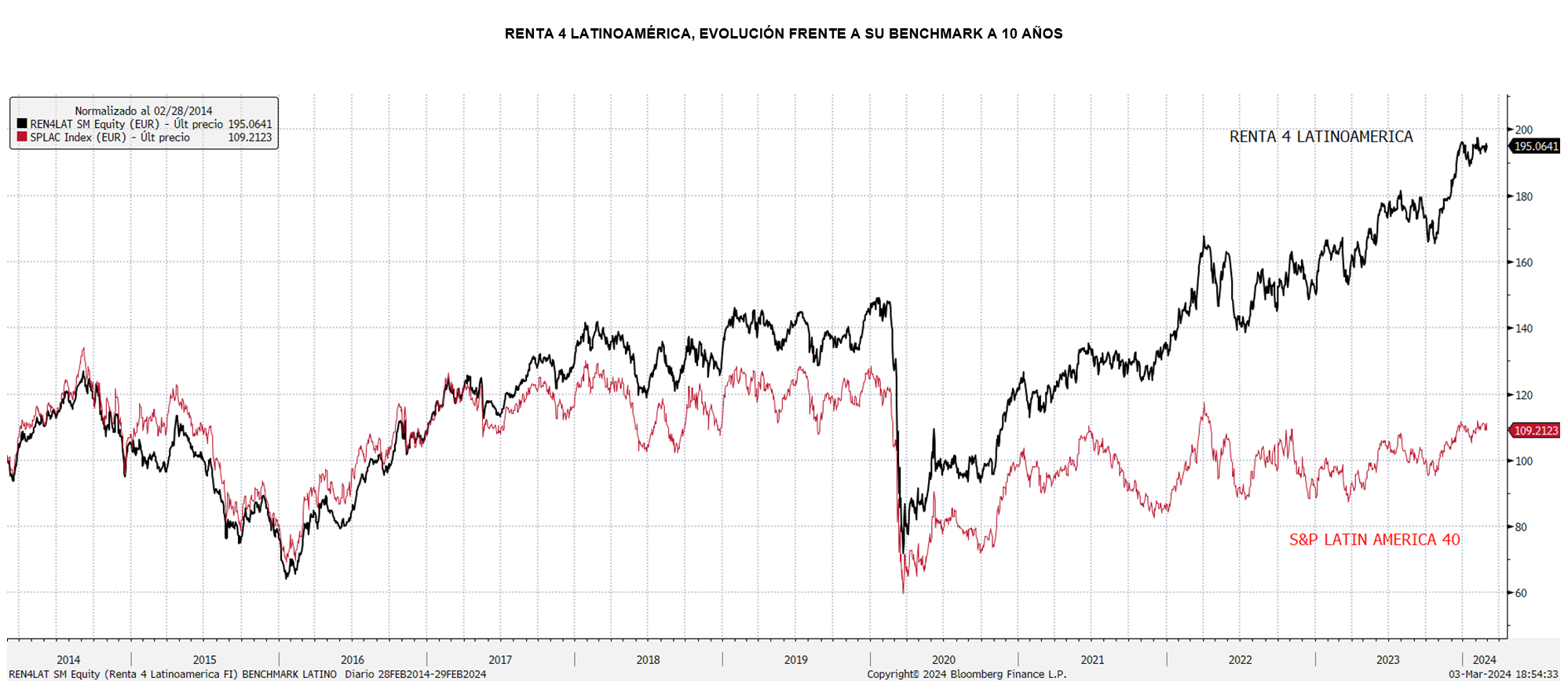 El fondo Renta 4 Latinoamérica se anotó en el mes de febrero un +0,6%, algo por debajo de su índice de referencia el S&P Latin América 40, que por su parte, sumó un +1,25% en euros. El fondo se vio perjudicado por el comportamiento del mercado mexicano, que descendió un 3,41% (un 2,38% en euros) en el mes. El resto de bolsas sudamericanas exhibieron un comportamiento más en línea con el resto de mercados globales. Así, la bolsa brasileña se anotó un 0,99% (un 0,69% en euros), mientras que la bolsa chilena sumaba un 7,73% ( un 4,4% en euros) y la bolsa colombiana terminaba plana en el mes. Por su parte el índice S&P del mercado peruano marcaba un 6% de ganancia el euros este mes donde alcanzó sus máximos históricos tras revalorizarse más de un 25% en los últimos 3 meses. Estas revalorizaciones, son especialmente meritorias dado que las bolsas de Latam, con la única excepción del mercado colombiano, se enfrentan a sus máximos históricos. El precio del petróleo, con una escalada superior al 10% en lo que llevamos de año, ejercerá un efecto beneficioso en economías como la brasileña o la colombiana y podría suponer un catalizador en próximos meses.