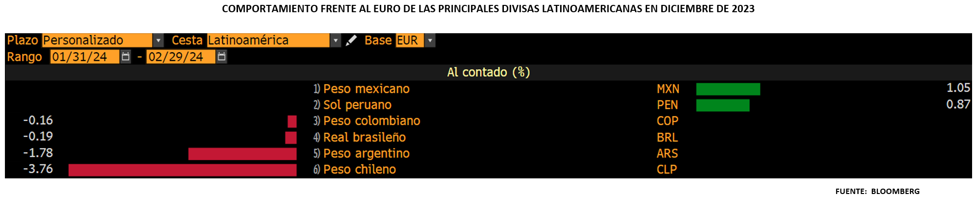 Hay que recalcar que este mes, las divisas se han mostrado algo más volátiles, con el sol peruano y el peso mexicano como únicas monedas con timidas revalorizaciones, frente al resto de divisas que se muestran estables o depreciándose.