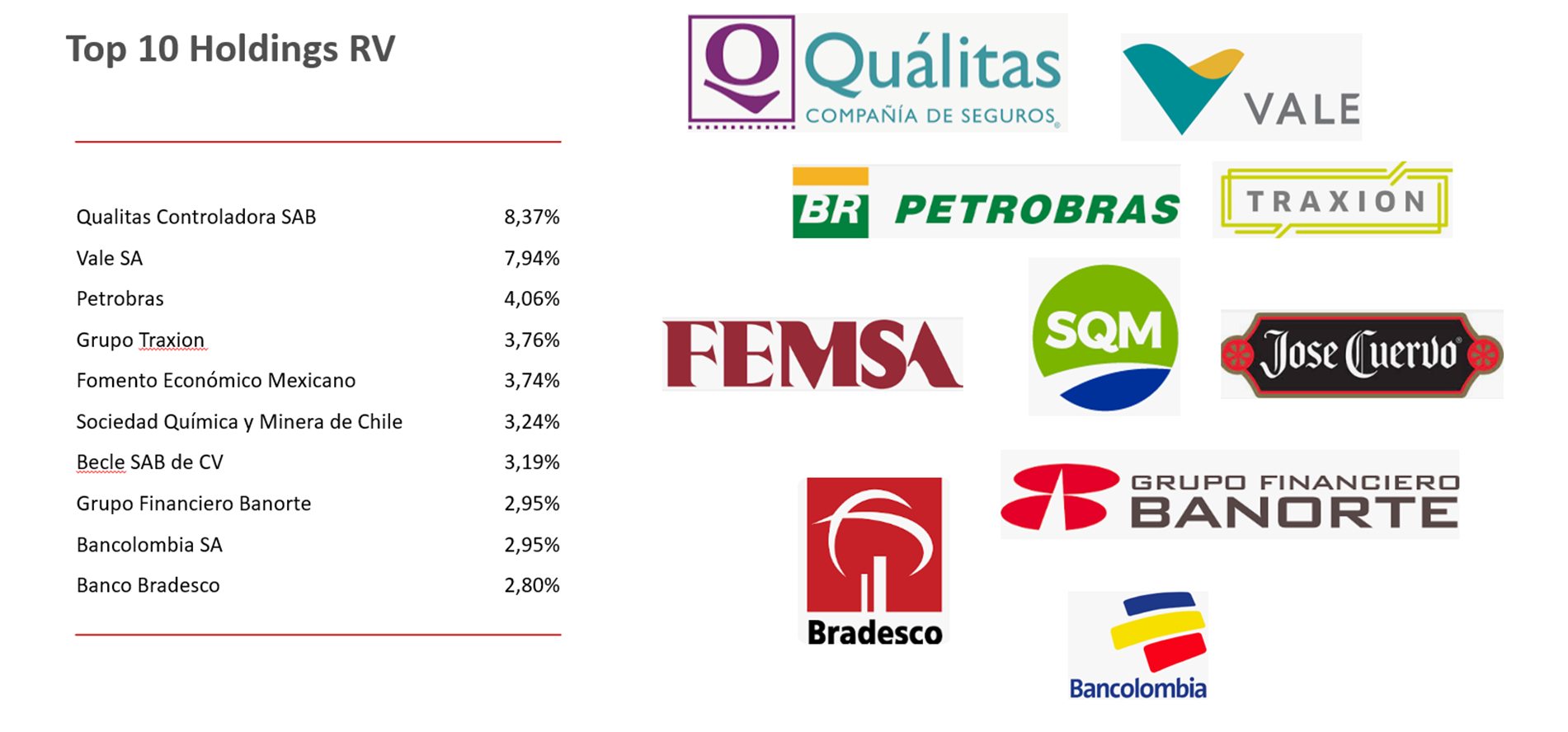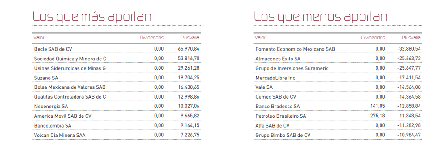 En relación a cambios en cartera, este mes hemos reducido en America Móvil, Cemex, Tecnoglass, y Volcan entre otras. También nos hemos deshecho de pequeñas posiciones en títulos de menor relevancia como Americanas, BAC Holding, Axtel, o Sitios Latinoamérica. En su lugar hemos reforzado posiciones en Branco Bradesco, Ecopetrol, Geopark y Grupo Sura entre otros.