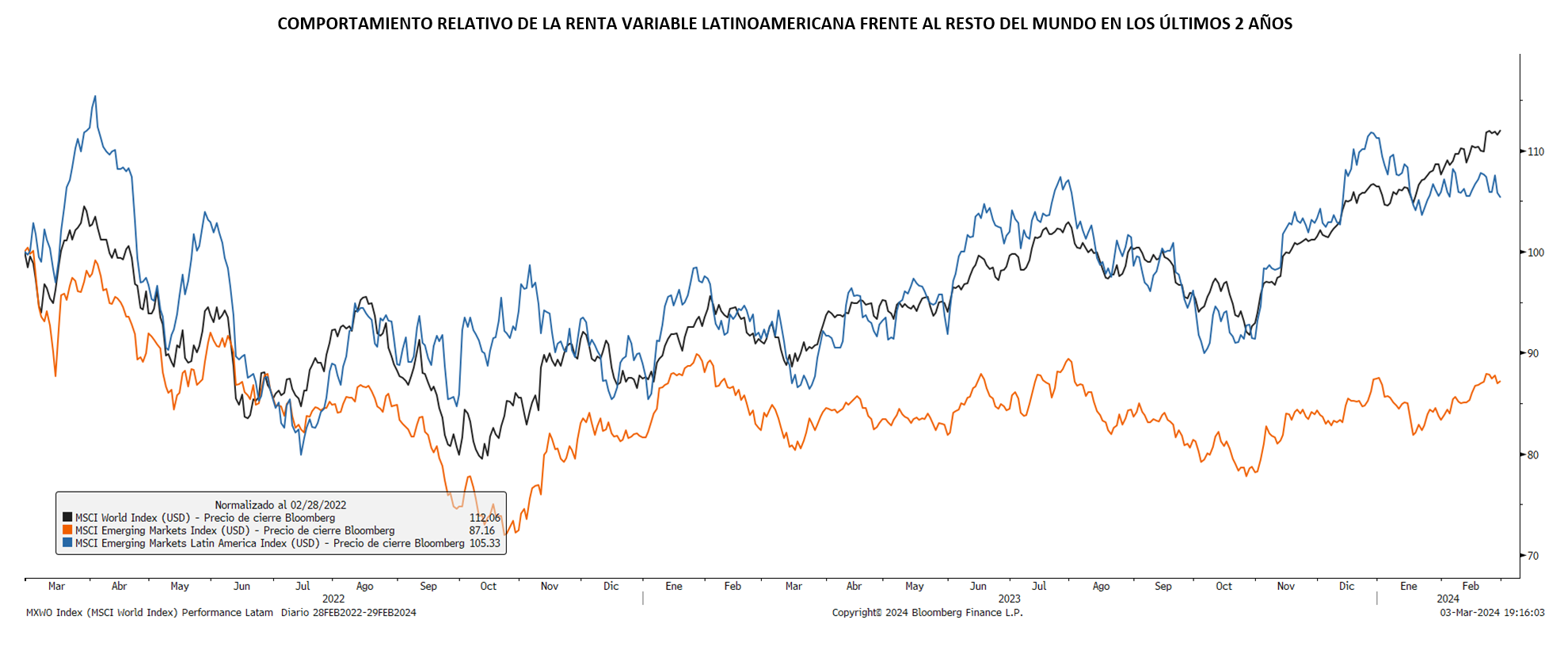 Enfrentamos el próximo año, con unas perspectivas inciertas en el continente y con retos estructurales y de política macroeconómica en la región, por lo que cabe esperar una cierta ralentización de la economía de Latam durante lo que resta de año. En nuestro fondo, vamos a buscar una moderación de nuestra exposición a México en próximos meses para enfrentar el proceso electoral de junio en el país con una posición algo más defensiva ante un previsible repunte de la volatilidad que podría brindar nuevas oportunidades, mientras regiones como Colombia o Chile podrían servirnos de refugio en esta especie de transición hacia un 2025 que promete mejores tasas de crecimiento.