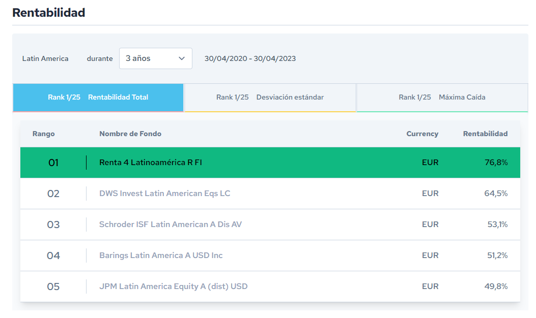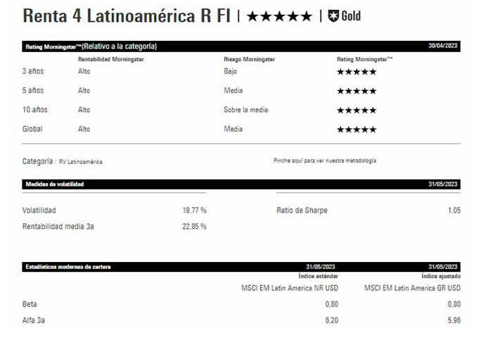 El fondo Renta 4 Latinoamérica figura como mejor fondo a 3 años en el último ránking de Citywire de su categoría con una rentabilidad acumulada del 76,8% en los últimos 3 años (datos del cierre de abril 23) y ha sido calificado como un fondo 5 estrellas “Gold” por parte de Morningstar.