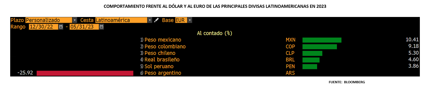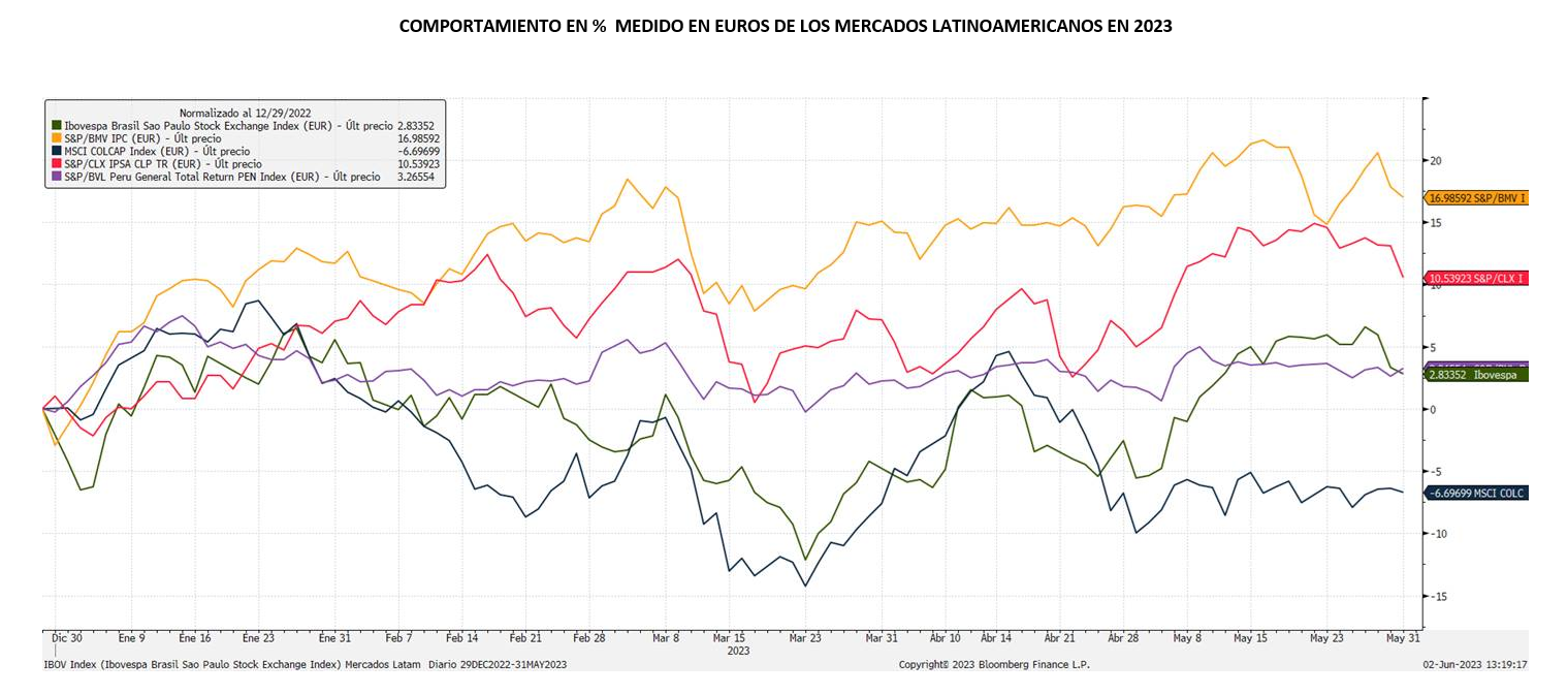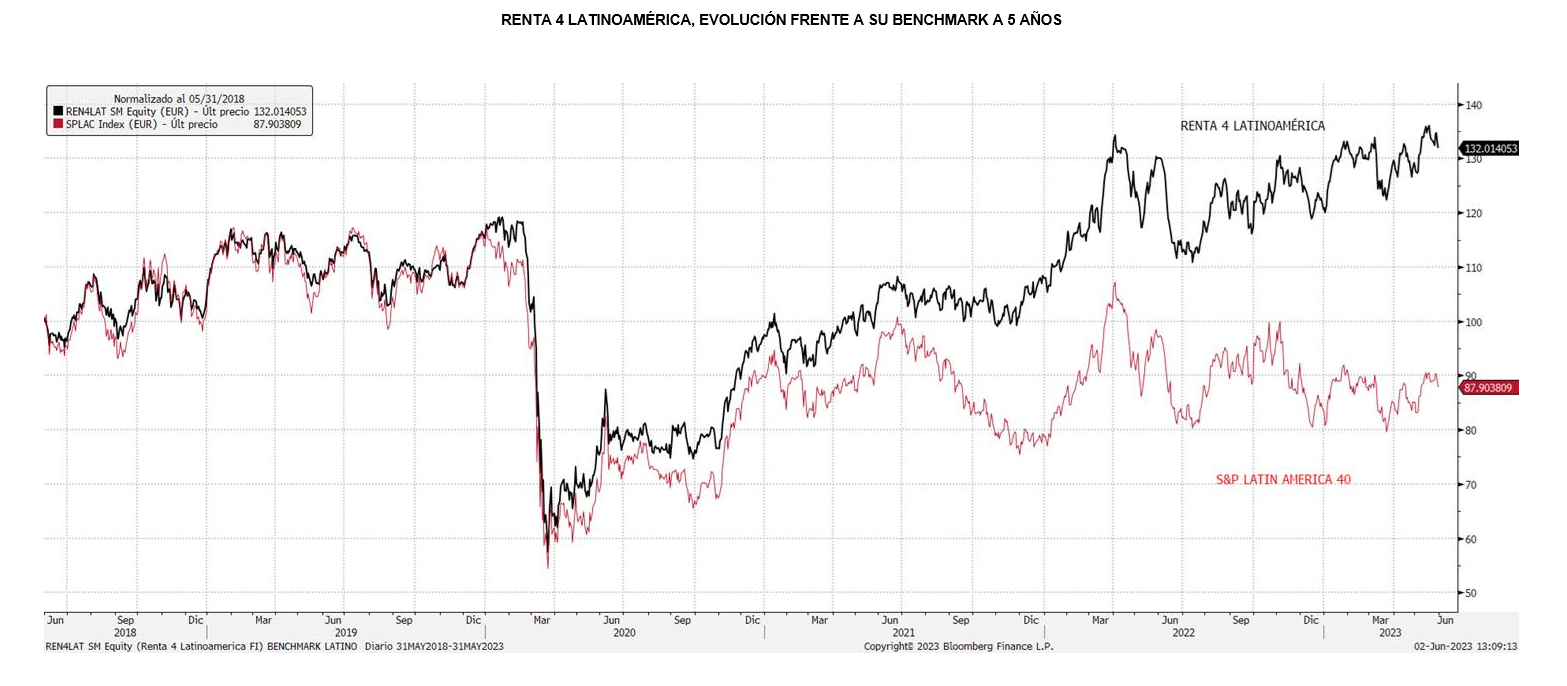 El fondo Renta 4 Latinoamérica sumó en mayo un 2,2%, un comportamiento ligeramente por debajo de su índice de referencia el S&P Latin América 40, que sumó un 3,47% en euros. Este resultado ha disfrutado del empuje de las divisas, que por ejemplo en el mercado mexicano ha permitido limitar las pérdidas de su índice. Las economías latinoamericanas están sufriendo este año los recortes en los mercados de materias primas. El Bovespa brasileño ha destacado este mes al mostrar el mejor comportamiento a nivel de índices, sumando un 5,5% en euros, gracias también al apoyo del real brasileño frente al euro. También Chile, ha destacado en positivo al sumar un 4,05% en euros (+1,02% en divisa local). El resto de mercados han mostrado un peor comportamiento en moneda local, donde por ejemplo México ha descendido un 4,3% o Colombia que se ha dejado un 8,32%, si bien al trasladar a euros estás rentabilidades las divisas han conseguido suavizar el impacto en el mes: Mexbol mexicano +0,62% medido en euros y Colcap colombiano +0,07% en euros. Por último Perú ha esquivado las pérdidas gracias a su divisa, que le ha permitido sumar en euros un 1,48%. Este resultado es meritorio, en un contexto donde los tipos de interés siguen subiendo y en niveles muy elevados, y donde mercados como China o Europa han tenido pérdidas debido al descenso de la actividad económica y a los temores de un default en los Estados Unidos. La principal preocupación se centraría ahora en el estado de salud de la economía China, que goza de una especial vinculación con la región debido a su importancia como demandante de materias primas.