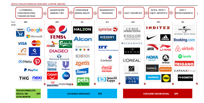 El fondo mantiene un peso equilibrado entre los tres grandes bloques: consumo defensivo (alimentación, bebidas, HPC, consumer & animal Health, ingredientes y packaging), consumo discrecional (lujo y cosmética, retail, textil, ocio y entretenimiento), y transformación digital del consumidor (e-commerce, comunicaciones, medios de pago).