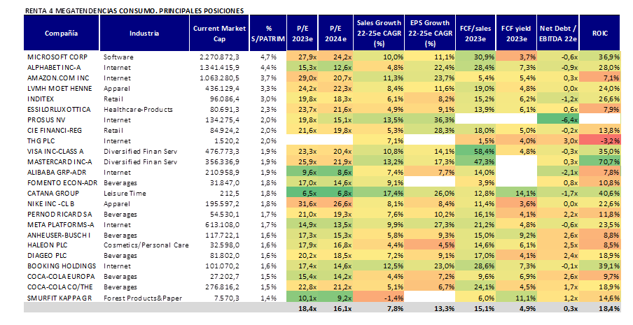 La cartera del fondo está diversificada en 69 valores, con las primeras 10 posiciones representando un 31% del patrimonio, con una calidad elevada, un potencial de revalorización interesante para los próximos años y está bien soportada por los altos niveles de generación de caja de las empresas que la componen (FCF/ventas >15%), y solidez financiera (0,3x DN/EBITDA 23e, muchas compañías con caja neta, no impactados por subidas de tipos en mayores costes financieros). Con crecimientos anuales medios ponderados de doble dígito en ventas y BPA, ROCE >20%, cotizan a múltiplos razonables (c. 5% FCF yield 2023e, PER 24e 16x). Creemos que el crecimiento en beneficios y expansión de múltiplos, nos debería aportar un rendimiento significativo en un horizonte de 3-5 años.