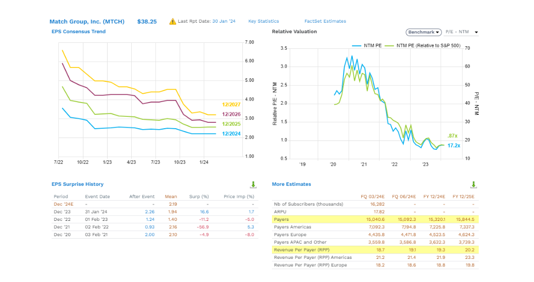 Match Group es el líder global en aplicaciones de citas online. Sus marcas son dominantes: más del 50% de las relaciones que comienzan en una aplicación / sitio de citas comienzan con una marca de Match Group. Tinder, que representa el 55% de los ingresos y la mayor parte de los beneficios del grupo, se encuentra en un momento de aumento de precios y reestructuración de planes de suscripción (suscripciones semanales, nivel super premium para monetizar a los usuarios avanzados), tras haberse quedado atrás en los aumentos de precios frente a competidores. El ingreso promedio de Bumble por usuario de pago es un 80% mayor que el de Tinder, lo que muestra la capacidad para aumentar precios. A pesar de ello, los ingresos de Tinder han crecido a un CAGR del 22% en 2018-22. En los últimos trimestres, no obstante, el crecimiento del número de usuarios de pago de Tinder se ha estancado, algo que indica un deterioro de la salud de la aplicación. Hinge es un impulsor (es uno de los principales contribuidores al crecimiento orgánico, con impacto acretivo en márgenes), así como su oportunidad de expansión geográfica (Hinge está en solo 20 países, muy por debajo de Tinder). El 70% de los costes son pagos a las tiendas de aplicaciones de Apple y Android a través de tarifas de compra. La legislación y litigios recientes están ejerciendo presión para que se reduzca el fee, que podría traducirse en una mejora de margen operativo de 5-10%. Desde un punto de vista de valoración, Match cotiza FCFy 24 >10%, a pesar de la aceleración de ingresos y beneficios esperada. Asumiendo 5 USD/acc de FCF para 2026e, a 8% FCFy, obtendríamos >60 USD/acc (vs. 38 USD/acc. actual)