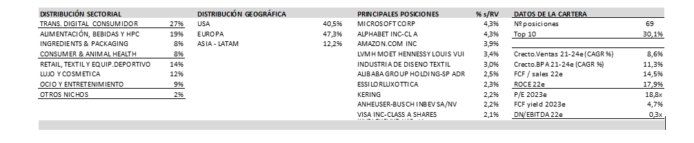 La cartera del fondo está diversificada en 69 valores, con las primeras 10 posiciones representando un 30% del patrimonio, con una calidad elevada, un potencial de revalorización interesante para los próximos años y está bien soportada por los altos niveles de generación de caja de las empresas que la componen (FCF/ventas c.15%), y solidez financiera (0,3x DN/EBITDA 23e, muchas compañías con caja neta, no impactados por subidas de tipos en mayores costes financieros). Con crecimientos anuales medios ponderados de doble dígito en ventas y BPA, ROCE >20%, cotizan a múltiplos razonables (c. 5% FCF yield 2023e). Creemos que el crecimiento en beneficios y expansión de múltiplos, nos debería aportar un rendimiento significativo en un horizonte de 3-5 años.