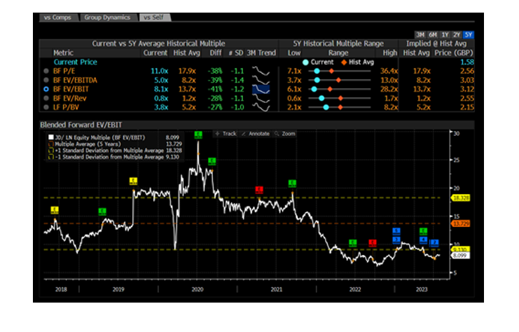 Siendo una historia de éxito en UK (38% s/ventas 2022), se ha expandido a Europa (26%), Norteamérica (31%) y RoW (5%). Tiene un mix equilibrado textil/calzado deportivo (c.50%/50%) y tienda física/online (72%/28%). El modelo de negocio es rentable (ROCE post tax exc.leases >50%), y generador de caja. Tiene solidez financiera (caja neta), buen uso de la caja, y está cotizando a descuento vs. comparables e historia (PER 24e de 10x). Nos parece una idea interesante teniendo en cuenta el crecimiento en beneficios (CAGR 22-25e>10%) y la probable expansión de múltiplos (vemos razonable 15x, una expansión del 50%, que aun así estaría por debajo de la media de 10 años en 18x). Aplicando 15x a beneficios 2024e (15,2 GPp) y 8x EV/EBITDA 24e llegamos a 230 GBp/acc (+55%), el VT de consenso está en 226 GBp (+53%).