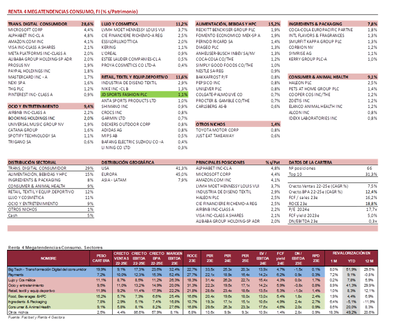 Renta 4 Megatendencias Consumo se revaloriza un 3,3% en julio, dejando la rentabilidad en lo que llevamos de año en el +16,3%. El mercado ha tenido un buen comportamiento en el mes apoyado en datos de crecimiento mejores de lo esperado, con una creciente confianza en un “aterrizaje suave”, un consumidor que sigue mostrándose resiliente, posibles nuevos estímulos en China, y resultados empresariales 2T23 razonablemente sólidos. Las posiciones con mayor contribución a la rentabilidad del fondo en el julio han sido Alphabet, Alibaba, THG, Airbnb y Universal Music. Las que más han drenado: Richemont, Shimano, Microsoft, Spotify y Bafang. El fondo cierra el mes con una exposición neta a renta variable del 93,9% (frente al 94,3% de junio).