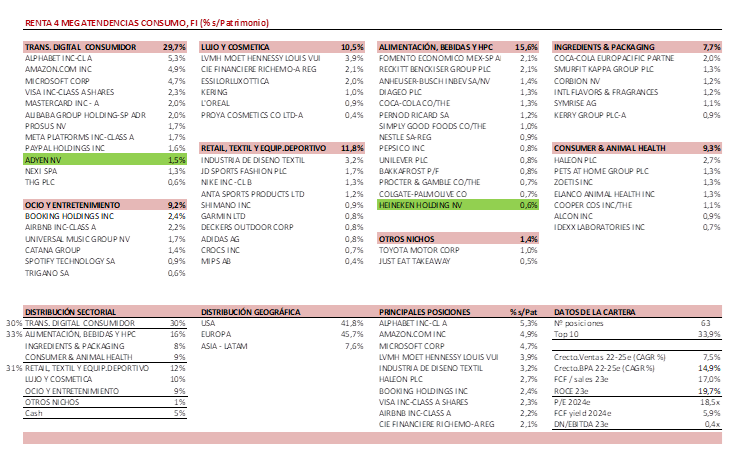 La cartera del fondo está diversificada en 63 valores, con las primeras 10 posiciones representando un 34% del patrimonio, con una calidad elevada, un potencial de revalorización interesante para los próximos años y está bien soportada por los altos niveles de generación de caja de las empresas que la componen (FCF/ventas >17%), y solidez financiera (0,4x DN/EBITDA 23e, muchas compañías con caja neta, no impactados por subidas de tipos en mayores costes financieros). Con crecimientos anuales medios ponderados de doble dígito en EBITDA y BPA, ROCE c20%,), cotizan a múltiplos razonables (c.6% FCF yield 2024e). Creemos que el crecimiento en beneficios y expansión de múltiplos nos debería aportar un rendimiento significativo en un horizonte de 3-5 años.
