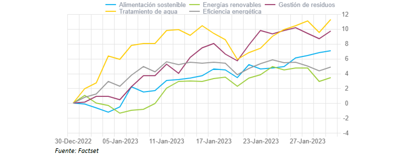 Renta 4 Megatendencias Medio Ambiente obtiene una rentabilidad del +7,6% en enero, frente a subidas del +4,6% del S&P 500 y +6,7% del Stoxx 600. Enero ha sido un mes positivo para la bolsa debido, principalmente, a una moderación en los datos de inflación, normalización en las cadenas de suministro y la reapertura de China (incrementando la demanda mundial).