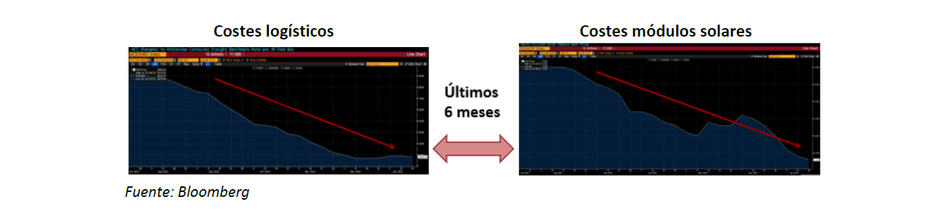 Uno de los mayores contratiempos para este sector durante el 2022 ha sido la inflación de materiales y costes de transporte. Sin embargo, como se puede apreciar en los gráficos inferiores, las cadenas de suministro han mejorado significativamente y la reducción de costes logísticos y de módulos solares es muy relevante.