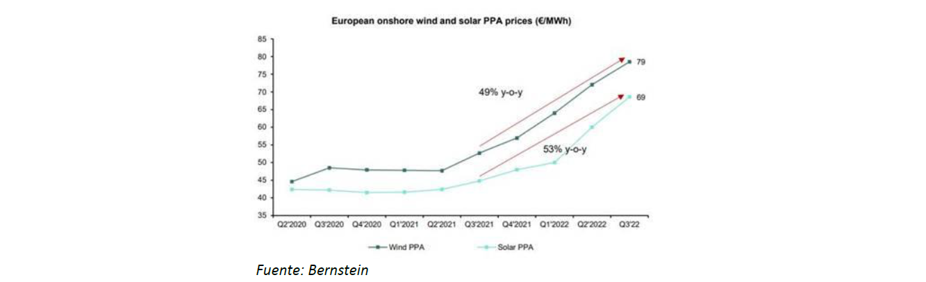 Por el lado de los ingresos, se están firmando acuerdos de venta de energía a plazo (PPAs) a precios muy superiores a los de hace 1-2 años, tanto para perfiles de energía solar como eólica. Actualmente 79-69€/MWh respectivamente vs. 45-40€/MWh hace 3 años.